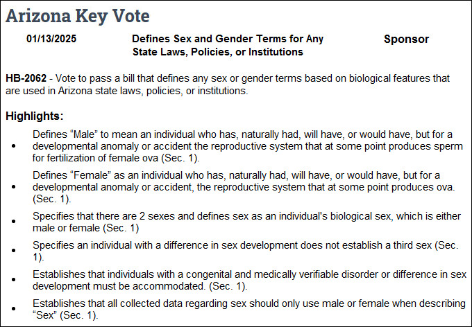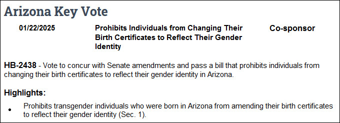 - Impact: Critics and advocacy groups like Stonewall Democrats of Arizona state this bill effectively "scrubs" transgender, nonbinary, and intersex individuals from public record.
