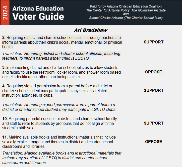 Ari Bradshaw, a Republican candidate for the Arizona State House, holds several specific positions regarding the LGBTQIA+ community, primarily focused on parental rights and gender-related policies in education. |