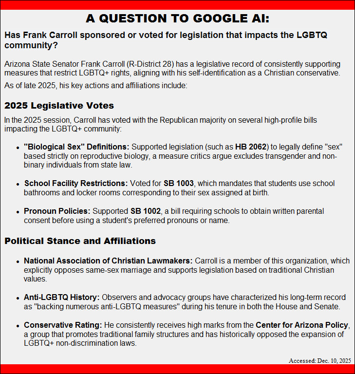 rabidly homophobic Frank Carroll is a member of the Arizona State Senate, representing District 28. He assumed office on January 9, 2023.