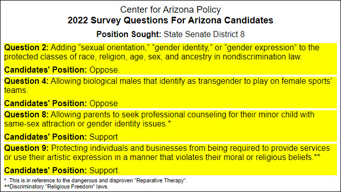 Protected Class for Sexual Orientation: Adding “sexual orientation” as a protected class alongside race, religion, sex, age, and disability in nondiscrimination law. (Candidate supports LGBTQIA Discrimination) |