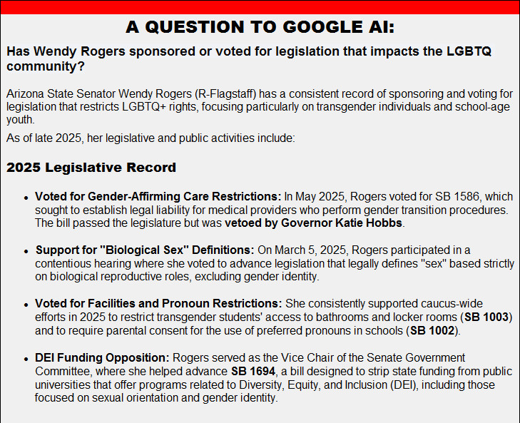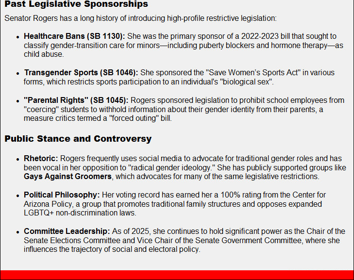 Wendy Rogers stated in the July 31 issue of Republican Briefs: “I am not backed by any PACs, lobbyists or special interests.""